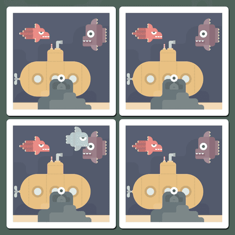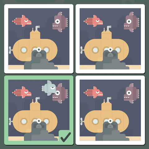 Vier identische Animationen – aber irgendetwas stimmt hier doch nicht... Hat der Fisch gerade gezwinkert? Bewegt sich der Asteroid wirklich genauso wie die anderen? Hier must du ganz genau schauen und darfst kein Detail aus dem Auge lassen! Eine der Animationen ist anders als die anderen, finde heraus welche es ist bevor deine Gegner es tun! Ob unter Wasser oder im luftleeren Weltall - dieses Spiel besticht durch seinen wunderschönen und ganz eigenen Grafikstil – doch lass dich davon nicht ablenken!